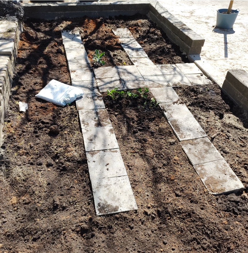 [..]Plantjes! Hoeveel zakken potgrond en compost heb je er al opgegooid? En de tegels liggen al!