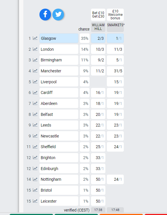 De odds voor de stedenSPOILEROm spoilers te kunnen lezen moet je zijn ingelogd. Je moet je daarvoor eerst gratis Registreren. Ook kun je spoilers niet lezen als je een ban hebt.![]()