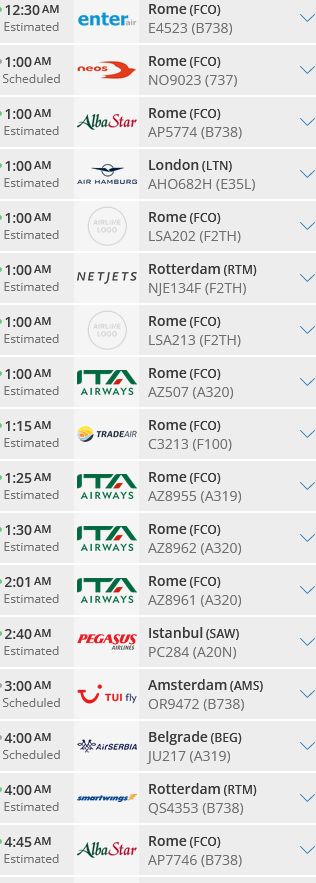 Er gaat alleen vannacht al een reeks vliegtuigen naar Italië en Nederland. Morgen nog meer. Wel veel charters dus. ![]() https://www.tirana-airport.com/c/59/real-time-departures | |