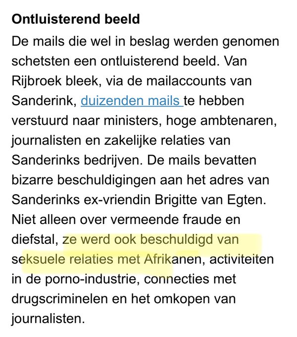 Dat verhaal kwam pas veel later. Deze "seks met Afrikanen" beschuldiging kwam vrijwel direct, toen Sanderink in november 2018 zijn band met van Egten verbrak. Sterker nog; hij voerde het aan als een van de redenen van de breuk. Dat daar later nog een heel DDS-fraude verhaal bij kwam doet er weinig toe, ik denk dat van Rijbroek haar verhaal over van Egten in 2018 nog helemaal niet zo compleet had en mogelijk zelfs de verduisteringen georganiseerd heeft toen bleek dat ze vat op Sanderink kon krijgen. | |