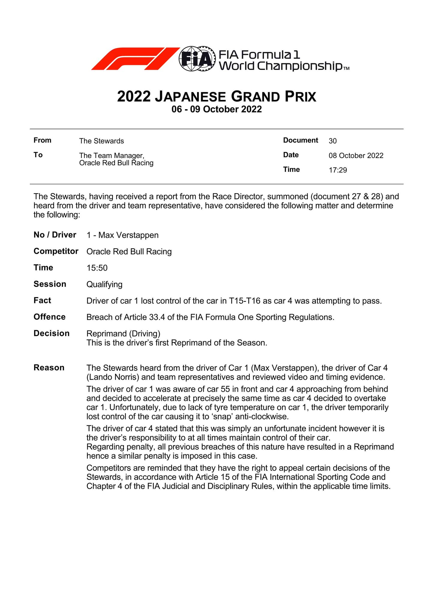 Nee de reprimande is dan ook voor het niet onder controle hebben. Het was geen opzet om Norris te hinderen/in gevaar te brengen.quote:Op zaterdag 8 oktober 2022 10:44 schreef WheeledWarrior het volgende:
