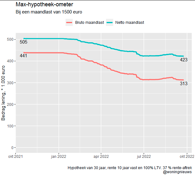 Dat is momenteel dus wel zo, omdat de prijsdaling altijd enige vertraging heeft. Zie mijn grafiekje voor max. hypotheek bij zowel bruto als netto maandlasten van 1500 euro.quote:Op donderdag 20 oktober 2022 12:27 schreef Kiid het volgende: