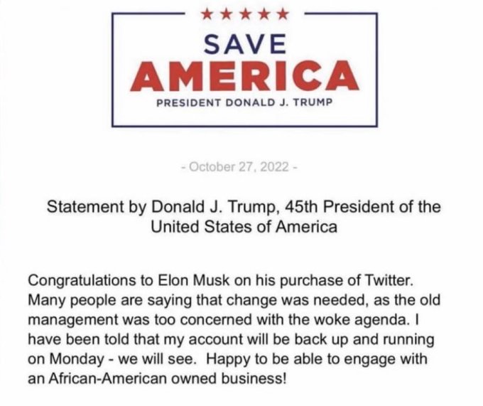 Deze post van ome Donald krijgt 1 woke piemeltje. Dit is de laagste score op de woke piemeltjes schaal.quote:Op vrijdag 28 oktober 2022 16:05 schreef AFCNiels het volgende: