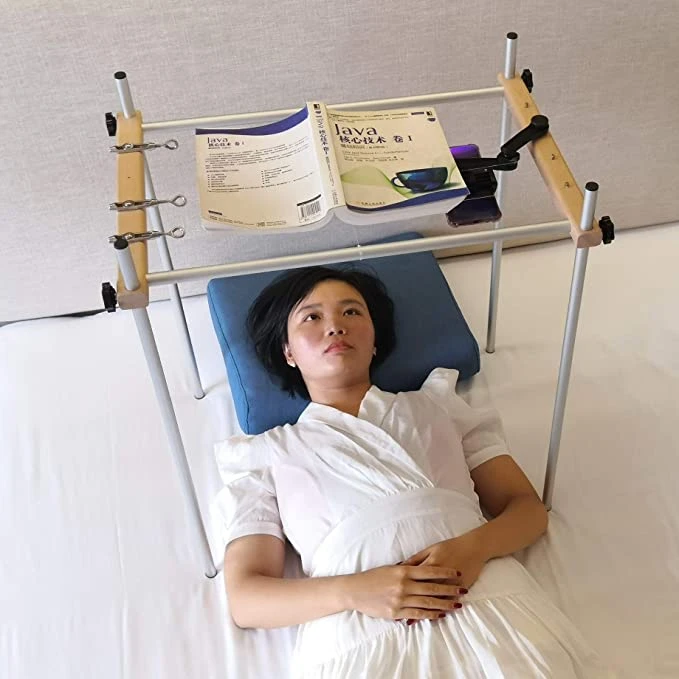 Maar die kan je niet op bed zetten, zodat liggend kan kijken