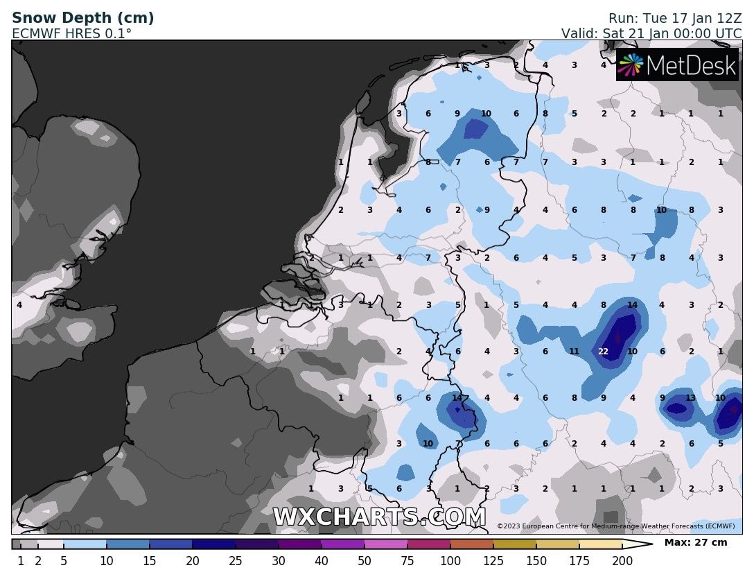 Denk het niet, zuidoostelijk Nederland kan echt wel enkele centimeters sneeuw verwachten vannachtquote:Op woensdag 18 januari 2023 15:11 schreef Elan het volgende: