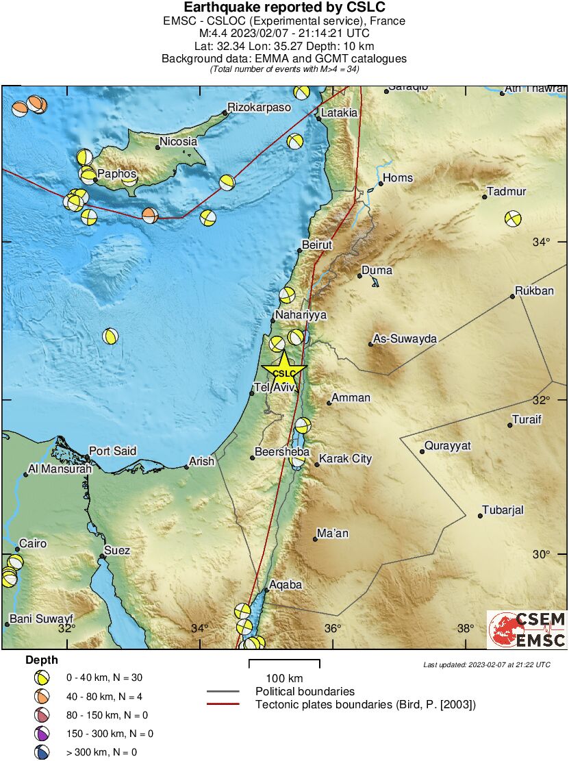 4.4-4.8 Epicentrum ligt bij de Dead Sea Transform, breuklijn die loopt van de Rode Zee naar Turkije | |