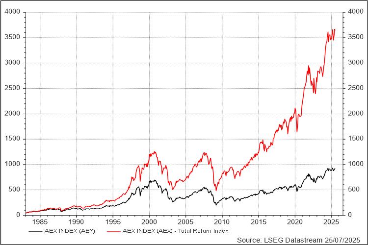 Vandaag is de AEX exact 40 jaar oud geworden. Het begon te handelen op ƒ100 (~¤45). Als de AEX een Total Return index was, dan stond deze nu op ¤2.834. Dat is een gemiddeld jaarlijks rendement van (2.834/45)^(1/40) = 10,9% sinds deze begon. Niet slecht.![]()