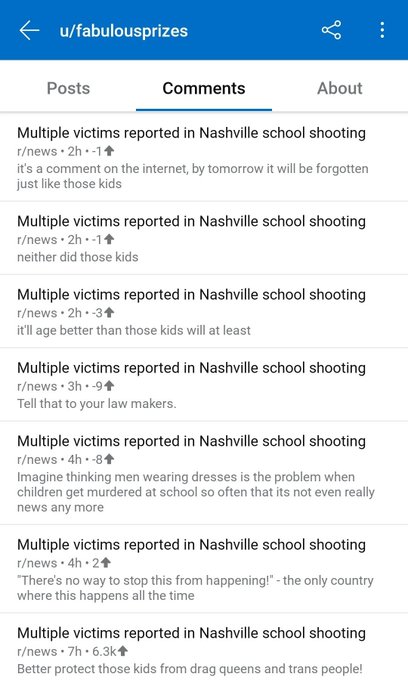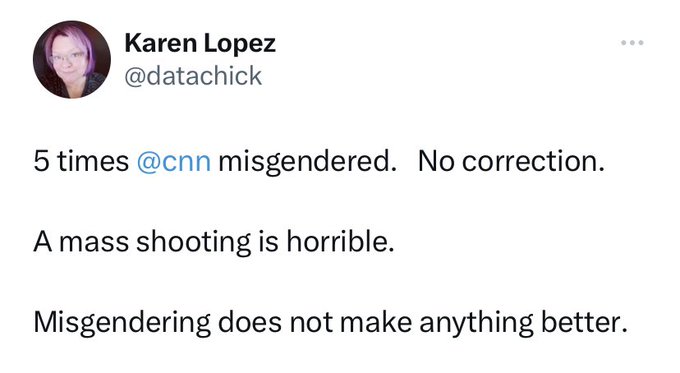Waar ik me het meest aan erger is die fake-empathie met de slachtoffers. "Oh, wat erg, die kinderen en leraren door een trans doodgeschoten". Die kinderen intereseert ze niets, ze gebruiken het argument voor hun eigen anti-trans agenda. Net zoals de media door te doen alsof ze pro-trans zijn (voor de meest extreme gevallen), via een U-bocht ook weer anti-trans en anti-anti-trans aanwakkert.