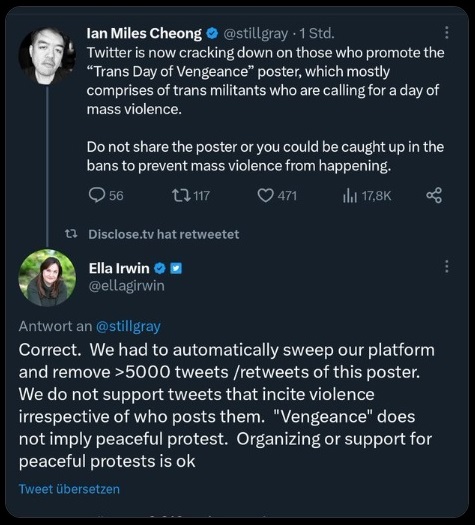 Maar hoeveel van dit soort trans-extremisten zijn er nou, als ik zoek op twitter op Trans Day of Vengeance dan ik zie vrijwel enkel reacties van mensen die juist anti-LGBT rechten zijn die het delen en er commentaar op hebben, sommigen zelf heel agressief. maken?