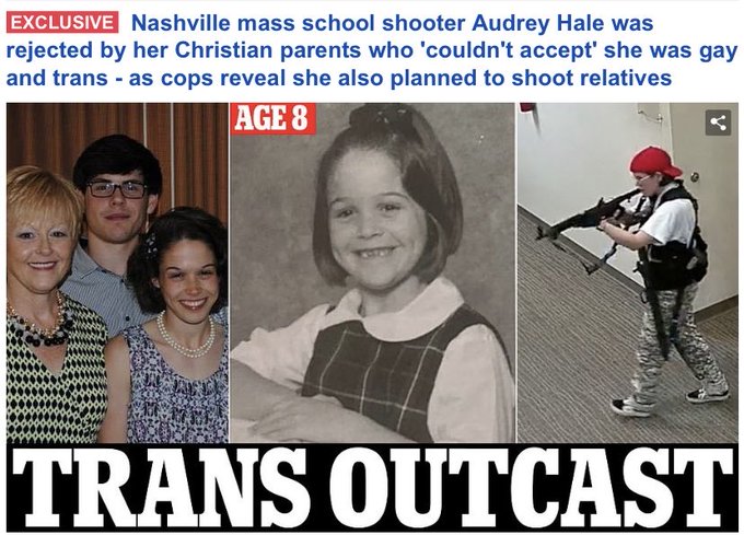 Lekker belangrijk ookquote:Police gave unclear information on the gender of the shooter, who police say was fatally shot by two responding officers at the school. For hours, police identified the shooter as a 28-year-old woman and eventually identified the person as Audrey Hale. Then at a late afternoon press conference, the police chief said that Hale was transgender. After the news conference, police spokesperson Don Aaron declined to elaborate on how Hale currently identified.