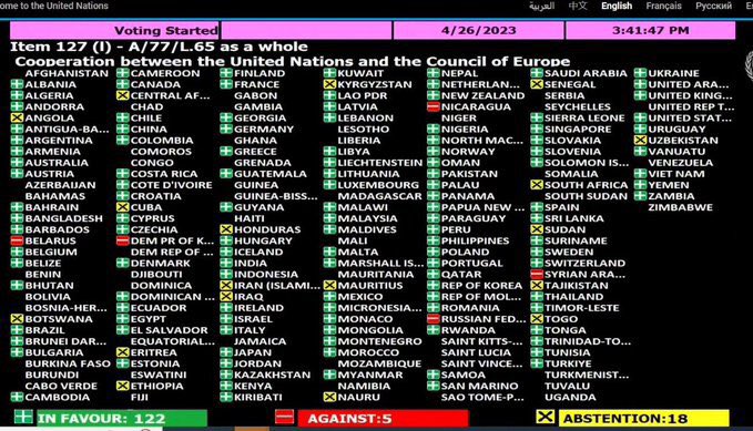 Alleen Belarus, Noord Korea Syrie en Nicaragua waren tegen net als uiteraard Rusland.