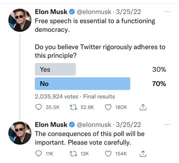 Dat is helemaal niet relevant. Geen enkele overheid mag op zo'n manier druk uitoefenen tenzij ze daar een (aantoonbaar) gegronde reden voor hebben waar Twitter het mee eens is. Zeker niet als je je profileert als 'free speech absolutist'. | |