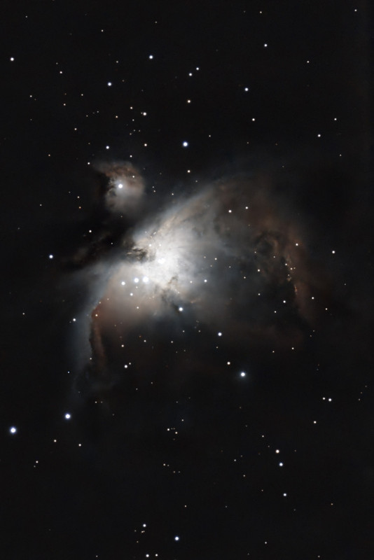 Gisteren was het eindelijk weer helder en heb ik de telescoop een mozaiek laten maken van de Orionnevel. Ik moet zeggen, de nabewerking is best een uitdaging. Hij is nogal helder (het helderste deepsky object aan het noordelijk halfrond volgens mij?) maar er zitten ook donkere stofwolken in. Het optrekken van de stofwolken zonder de kern van de Orionnevel te helder maken is best een uitdaging. Ik moet er nog verder aan sleutelen maar voor vanavond vind ik het wel mooi geweest ![]() | |