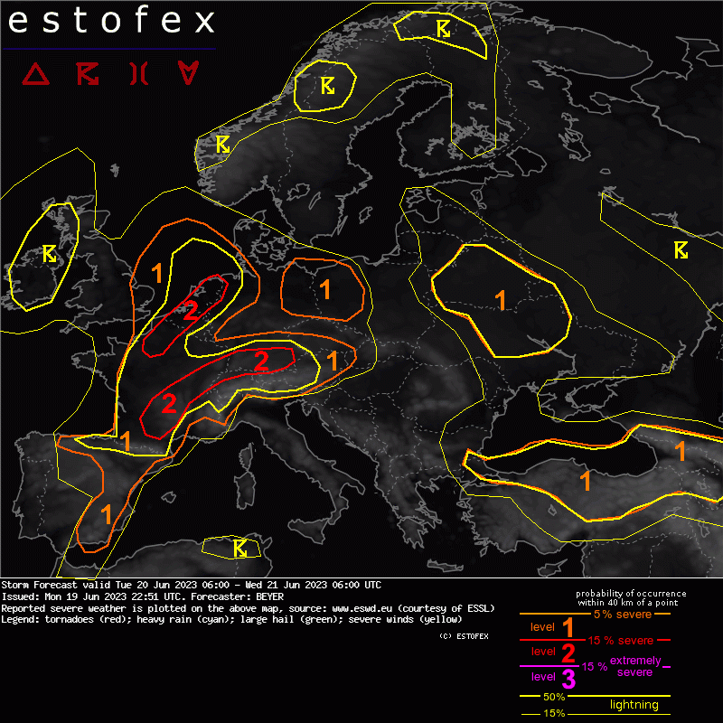 https://www.estofex.org/quote:A level 3 was issued across parts of Germany and Czechia mainly for damaging wind gusts, large to very large hail and (regionally) for tornadoes and heavy rainfall.
