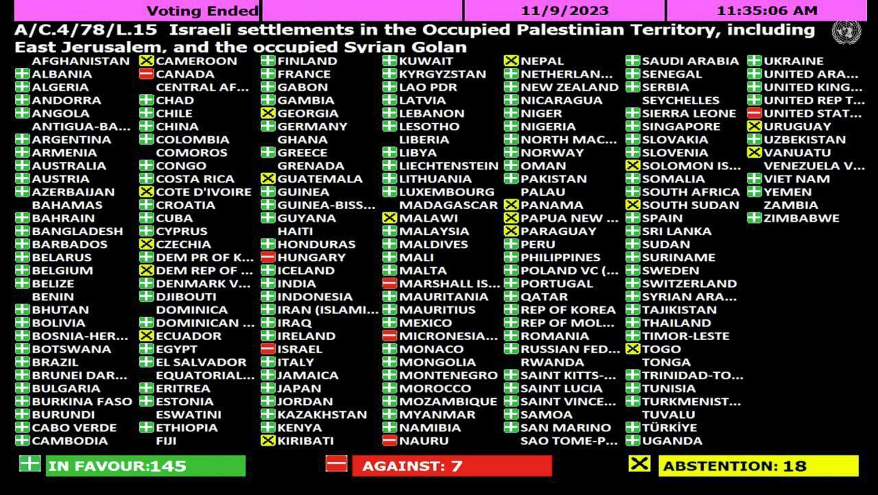 Tja, als men kon stemmen over het vraagstuk of eigenlijk heel Israël "bezet gebied" is, zou dit ook zonder probleem worden aangenomen. Ondertussen kan een motie om Hamas te veroordelen niet worden aangenomen. Dit zegt genoeg over de VN, het is gewoon bespottelijke organisatie die zo snel mogelijk moet worden opgedoekt.