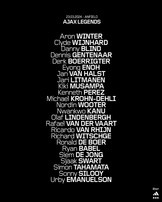 Ik mis Frank de Boer, Seedorf en Davids bijvoorbeeld, die zijn meen ik nog aardig fit, maar het valt uiteraard niet mee om op een bepaalde datum zoveel mensen bij elkaar te krijgen. | |