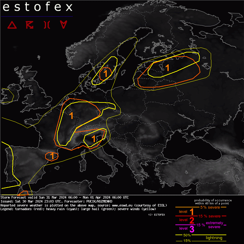 A level 1 was issued in a belt from France to Czechia mainly for tornadoes, severe wind gusts and to the lesser degree for marginally large hail.