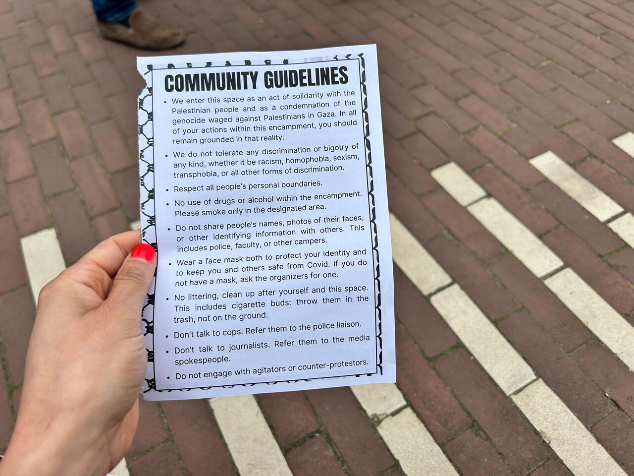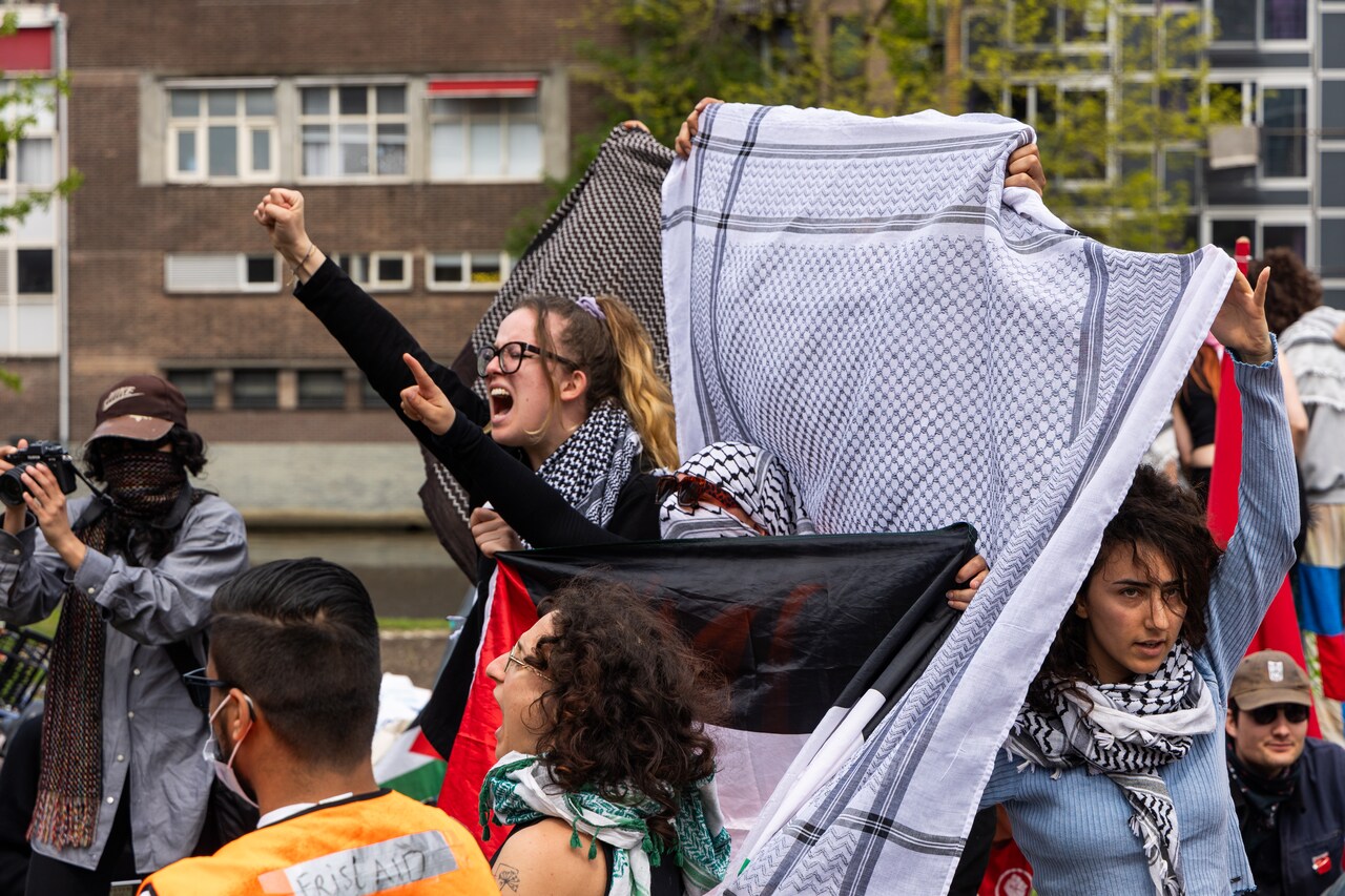 quote:Op het terrein van de universiteit staan zo’n twintig tenten en er worden mondkapjes uitgedeeld aan omstanders. De meeste studenten spreken geen Nederlands, sommigen zitten op hun laptops te studeren. De politie is aanwezig en staat vanaf een afstandje toe te kijken. In het Engels en Arabisch worden pro-Palestijnse leuzen geroepen, zoals ’from the river to the sea, Palestine is almost free’.