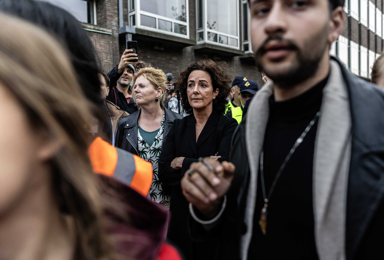 Behalve studenten, zijn er ook tientallen docenten aanwezig bij het protest. Zij steunen de demonstratie en zijn er om een eventueel schild te vormen voor als de politie ingrijpt, zegt hoofddocent en politiek antropoloog Martijn Dekker.