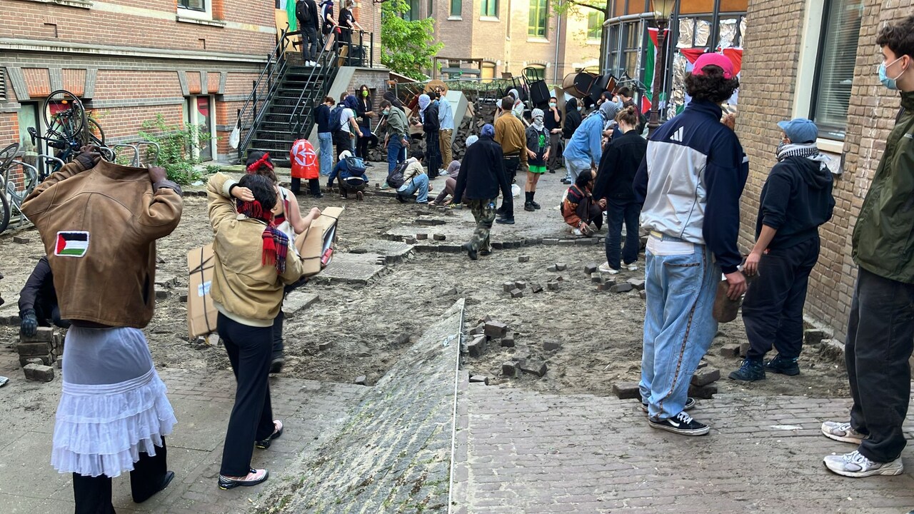 Demonstranten zijn bezig alle stenen uit de straat te lichten in de Oudemanhuispoort. De stenen worden door lange rijen mensen doorgegeven naar de barricades. De mensen met de stenen zeggen dat ze die gebruiken om de barricades te verstevigen. “Niet om naar de politie te gooien.”