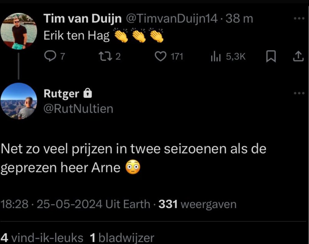 Dat het geen Nederlander is, iemand die met niet voor de hand liggende clubs kampioen is geworden en dat hij een moderne visie op het trainerschap heeft stemt mij in ieder geval positief Er zijn wel meerdere signalen inmiddels dat het geen trainer is die de speelstijl van Slot zal kopiëren, dat zal even wennen worden maar misschien is het juist goed dat we geen 2e Arend Martijn proberen te vinden want die is toch uniek. | |