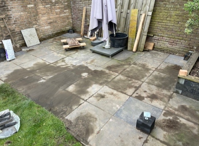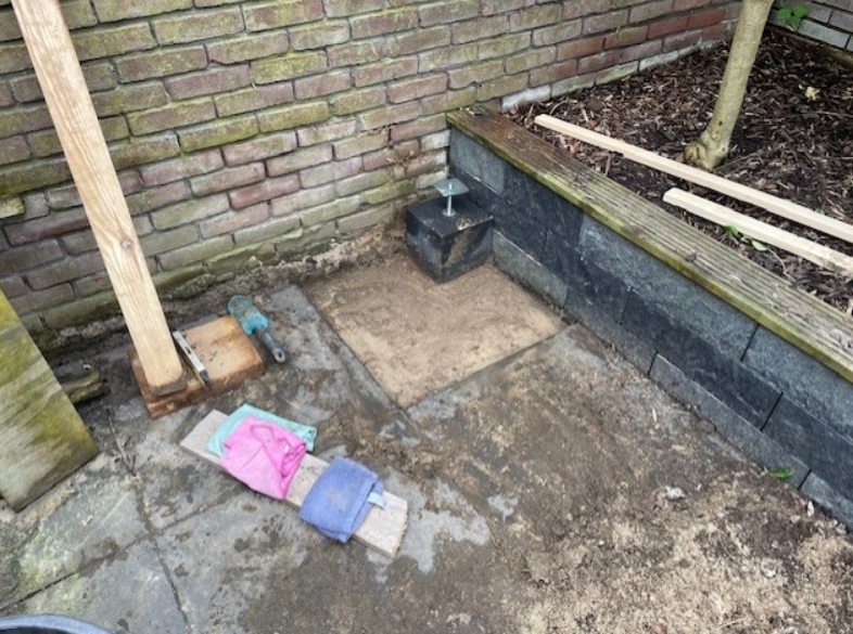 Zow! Dat was het wel weer voor vandaagPoeren staan erin, aangevuld met beton en zand en een tegel erop. Beetje aangeveegd.