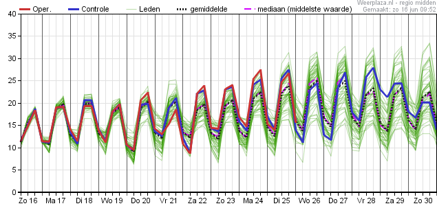 | Tyfushitte over anderhalve week. De oper gaat richting de 30 graden. Gemiddeldes boven de 25 graden. Doe mij maar het prachtige weer van de eerste twee weken in juni! | |