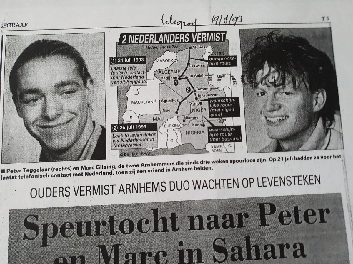 quote:In 1993 maken Peter Teggelaar en z'n vriend Marc Gilsing (beiden 24) een autotrip dwars door de Sahara. Peter had zo'n reis al twee keer eerder gemaakt en wist precies wat 'm te wachten stond. Maar als familie en vrienden te lang niets horen, worden ze onrustig. Zeker als de jongens op enig moment alweer terug in Nederland hadden moeten zijn. Een zoektocht volgt, maar heeft een uitkomst die niemand had kunnen bedenken.