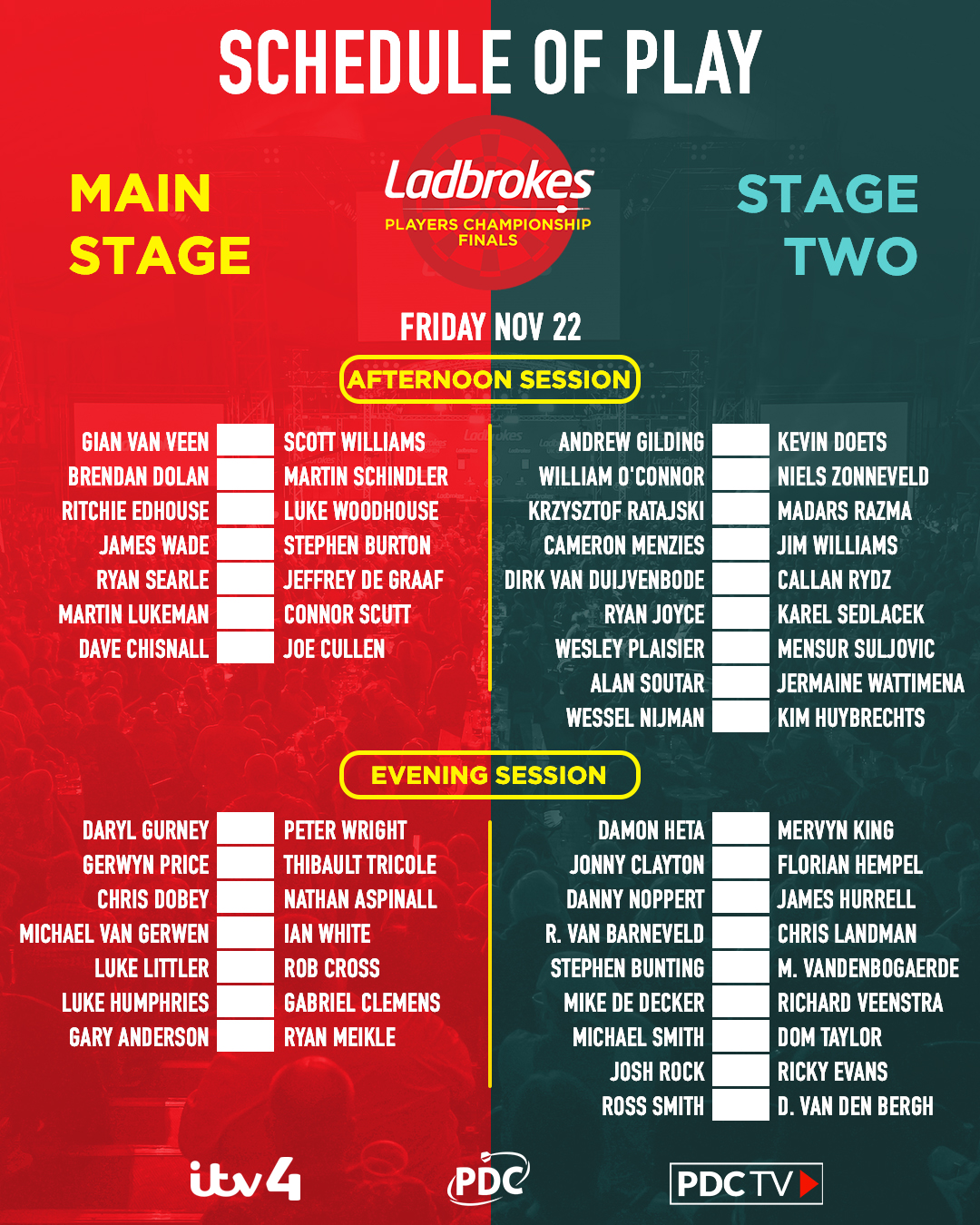 | Tour Card Holders Absent: Ronny Huybrechts, Paul Krohne, Adrian Lewis, Josh Rock, Pascal Rupprecht, Peter Wright, Jules van Dongen, Adam Smith-Neale, Leighton Bennett. Non-Tour Card Holders Competing: Connor Scutt, Wesley Plaisier, Christian Kist, Andy Boulton, Jimmy van Schie, John Henderson, Dragutin Horvat, Lee Cocks, Darryl Pilgrim. @Poepz0r Volgende week Van Schiegenot | |