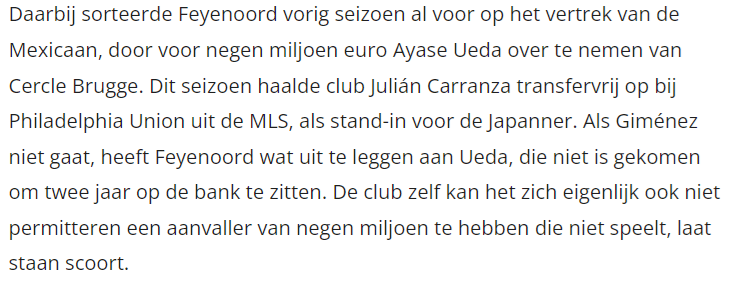 Onder dat rijtje spelers past ook Zerrouki en Ueda. Niet alles kan een voltreffer zijn.quote:Op woensdag 21 augustus 2024 08:08 schreef alopio het volgende: