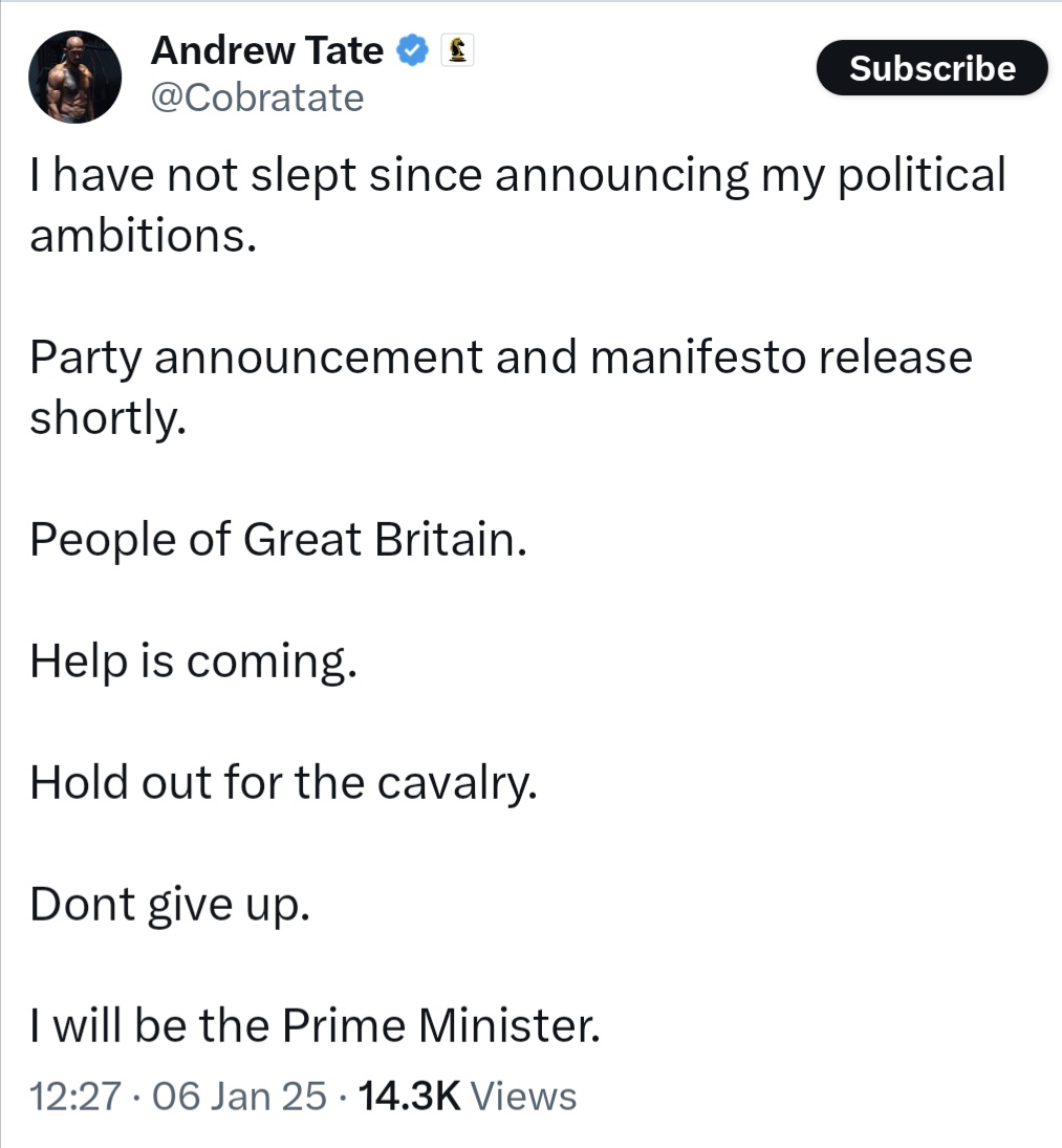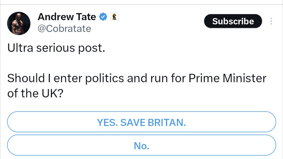 Eerst vraagt hij King Charles om de regering te ontbinden en vervolgens post hij een peiling of zijn bots het een goed idee vinden als de VS, waar hij door zijn inkopen bij Trump een grote invloed op heeft, het VK binnenvalt om de democratisch gekozen regering omver te werpen. Hoe zie je dit niet als gevaar voor de democratie? | |