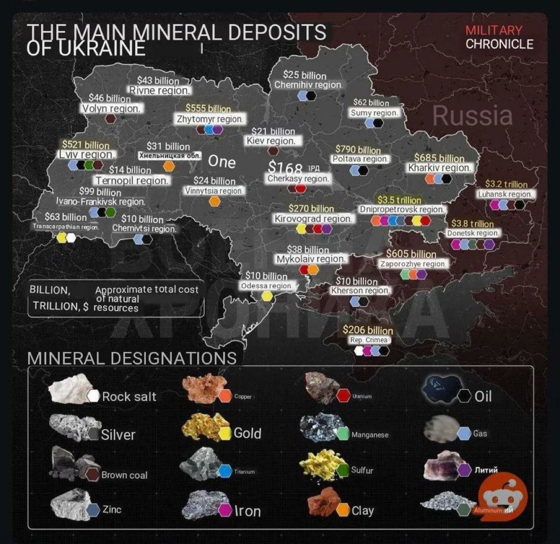 Ik heb het niet helemaal gevolgd. Voor vrede is dit misschien wel een goede deal. Maar is vastgelegd waar in Oekraine de grondstoffen zitten die de VS kunnen claimen? Of liggen die vooral in gebieden die nu bezet zijn door Rusland? Dat zou wel mooi zijn, als de VS Rusland eruit kicken, mogen ze de grondstoffen in de heroverde gebieden delven. Maar Trump kennende zal dat het wel niet zijn.quote:Op dinsdag 25 februari 2025 21:40 schreef LXIV het volgende: