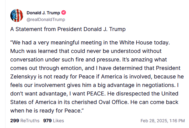 Trump and Vance just got into a literal shouting match with Zelensky in full view of the press. Wow. Trump says, “You have NO right to dictate what we should feel. You are gambling with World War III.”