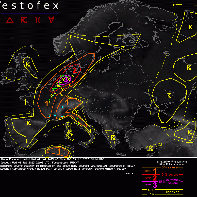 A level 1 surrounds both other levels for a hail, strong to severe downburst and heavy rain risk.