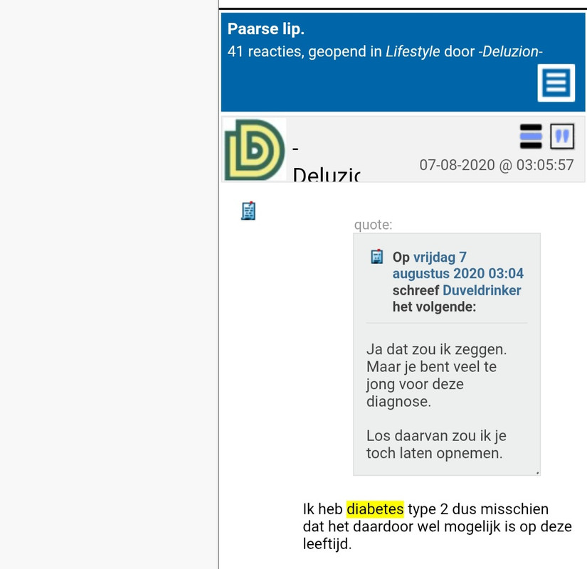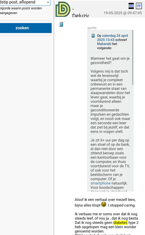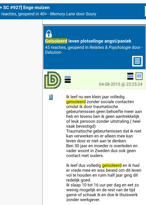 De huisartsenpraktijk voelde zich een keer geroepen om in het periodiekje een lijstje te geven waarop je kon testen op alzheimer. Snel naar gekeken. Tjonge, als tiener had ik blijkbaar al dik bewezen alzheimer. Heb ze er later mee geconfronteerd. Vonden ze niet leuk. Op een ander forum zag ik het lijstje dat naar narcisme verwijst. Met wat ik zoal over aandoeningen als narcisme, borderliner, ADHD las, was dit is een lijstje van borderliners. Dat is onderdeel van narcisme en geen bewijs van narcisme tenzij er nog een aantal typisch narcistische kenmerken in staan, maar ik zag alleen de beschrijving van boderliners. Er werd verontwaardigd geroepen dat het lijstje van een narcistenwebsite kwam. Fijne informatie geven ze daar. Die lijstjes zijn veel te slordig gesteld en gepresenteerd en het maakt vaak niet uit of het door specialisten of door zelfhulpgroepen geschreven is. @deluzion, je zei min of meer dat je nu duidelijkheid had. Ga dat niet overhoop gooien met nieuwe zijwegen die mogelijk misschien wel zouden kunnen aansluiten bij je ervaringen. Hou vast aan die duidelijkheid en vraag hulp om een uitvoerbare goede weg uit te stippelen. Er zijn verschillende soorten buddy-projecten. Wel een uitzoeken die duidelijke doelen stelt, want dat helpt tegen afdwalen & ronddolen. | |