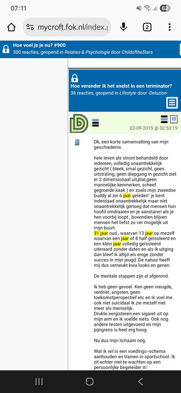 Dank je, met zo'n reactie kan ik wel leven. Het is alleen jammer dat sommigen het nog steeds anders zien. Ik bedoel: al mijn jeugdvrienden van vroeger, waar ik zo'n tien jaar intensief mee optrok, zijn inmiddels gesetteld. Denken mensen dan echt dat ik zó anders in elkaar zit qua innerlijk dan mijn vrienden van toen? Mijn beste vriend van de middelbare school, waar ik jarenlang dagelijks mee optrok, is inmiddels voor de tweede keer getrouwd en heeft vier kinderen. Mijn állerbeste vriend die ik al kende sinds groep 1 van de basisschool en met wie ik bijna 30 jaar bevriend ben geweest, heeft ook gewoon een partner en kinderen. Wat ik al vroeg merkte, is dat vrouwen mij structureel negeerden maar mijn vrienden niet. Er werden ook geregeld opmerkingen gemaakt zoals: "Ik heb nog nooit zo’n lelijke jongen gezien als TS." Of vrouwen die me gewoon letterlijk in mn gezicht uitlachten. En als ik niet werd uitgelachen dan werd ik compleet genegeerd, alsof ik niet eens bestond en dit gebeurt nog steeds! | |