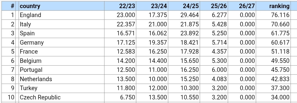 De tabel uit OP is voor de prestaties van dit seizoen enigszins vertekend, want het toont het gemiddelde van de punten die door de ploegen gehaald zijn. Aangezien zowel Portugal als Belgi 'slechts' 5 ploegen hebben, is voor hen de deler gunstiger.quote:Op vrijdag 29 augustus 2025 08:50 schreef RamboDirk het volgende: