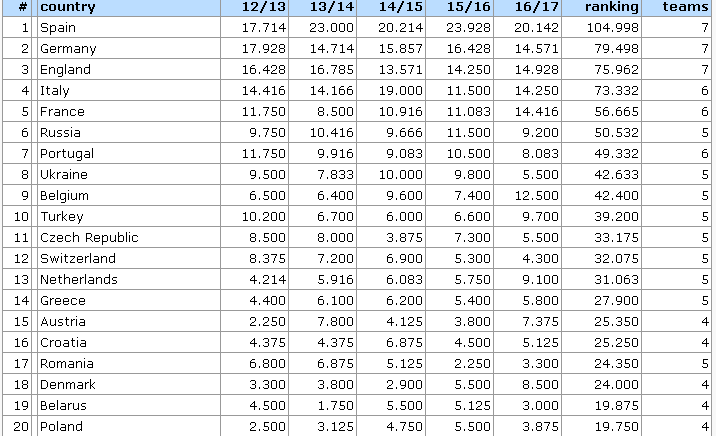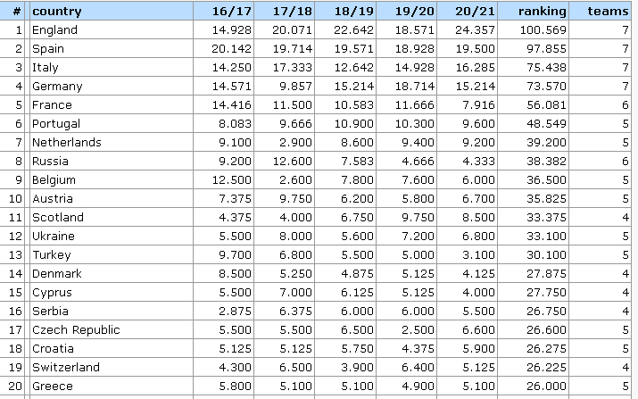 Rusland was destijds een stevige concurrent met clubs als Zenit Sint-Petersburg, CSKA Moskou, Spartak Moskou en Lokomotiv Moskou (grappig, ik weet er nog een aantal). Ze stonden toen netjes op de 8e plaats, maar zijn inmiddels weggezakt naar plek 26. Oekraïne is door de oorlog teruggevallen naar de 23e plaats.