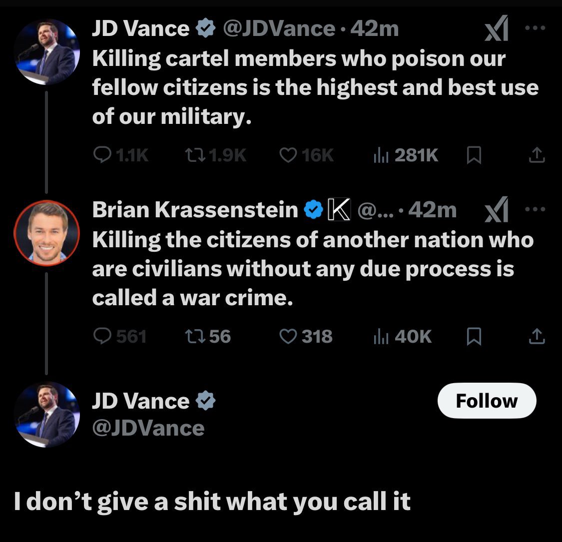 De Amerikaanse staat hoopt met dit intimiderend geweld op een maatschappelijke verandering van de drugscriminelen dat ze nu koffie en thee gaan telen en vanwege deze initmidatie met liquidaties zonder rechtsgang afscheid nemen van de meest lucratieve business ter wereld.quote:Op vrijdag 24 oktober 2025 10:30 schreef HowardRoark het volgende: