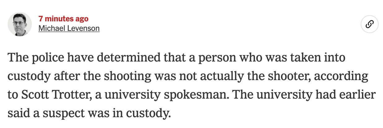 CNNquote:Update: Now the UVU spokesman says the suspect in the shooting of political activist Charlie Kirk is not yet in custody, despite the school saying earlier police did have someone in custody.