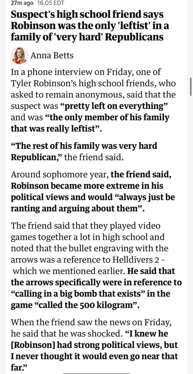Er is wel geroepen dat het een vreugde-schot van eigen aanhang was die in Charlie's halsslagader terecht gekomen was.quote:Op zaterdag 13 september 2025 09:21 schreef KoningWouter het volgende: