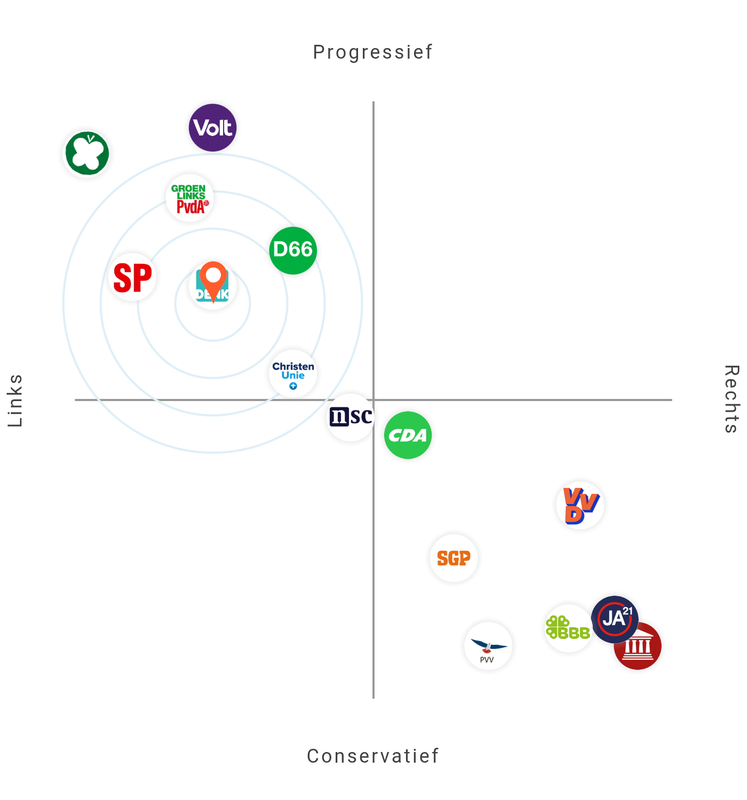 Ik vind de indeling van de partijen op die links/rechts en progressief/conservatief as wel bijzonder, met name het lege veld op conservatief-links.
