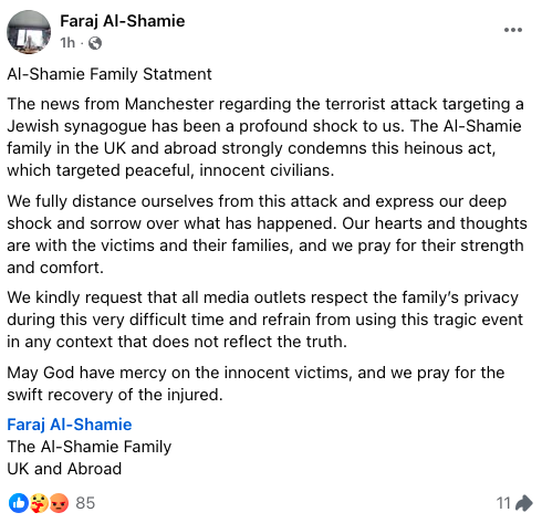 De Britse politie heeft de identiteit bekendgemaakt van de verdachte van de dodelijke aanslag bij een synagoge in Manchester. Het gaat om de 35-jarige Jihad al-Shamie, een Brits staatsburger van Syrische afkomst.