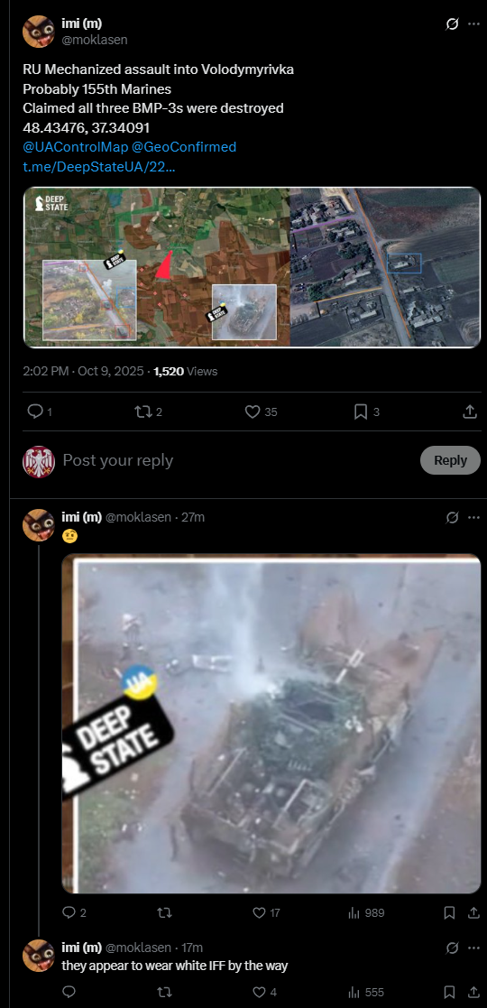 Gemechaniseerde aanvallen bij Pokrovsk zijn overigens begonnen, inderdaad gewacht op slechter weer en minder groen.