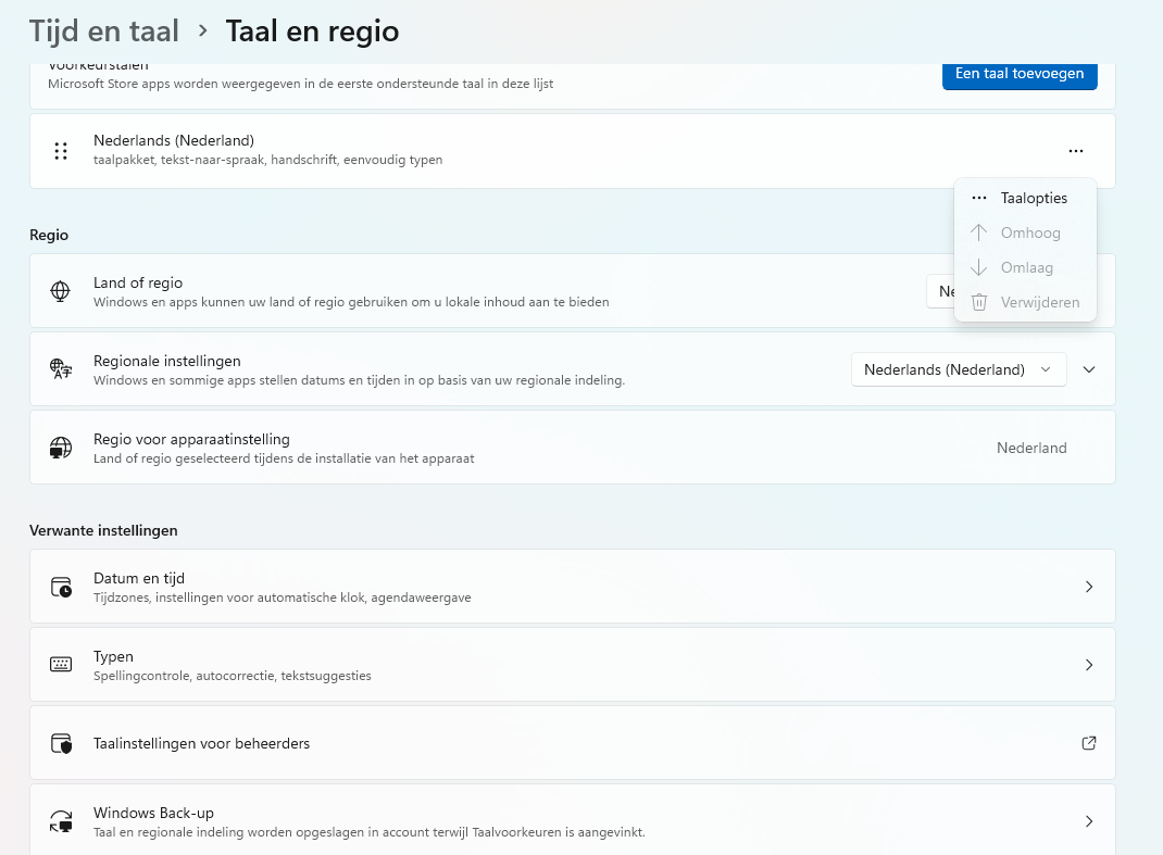 Op NLD NLD klikken rechtsonder en daar op iets van 'meer toetsenbordinstellingen'?