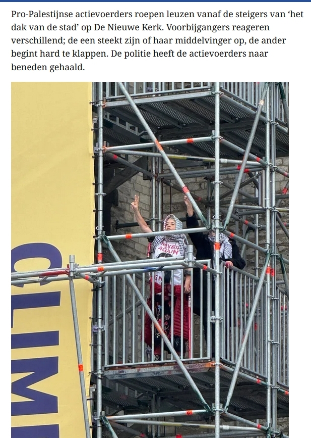 quote: Verf op Paleis op de Dam nog altijd te zien: 'Schade rond één miljoen euro'Dinsdagochtend is het Paleis op de Dam in Amsterdam beklad met rode verf door pro-Palestijnse activisten; woensdagnamiddag was de verf nog niet volledig verwijderd. Het Rijksvastgoedbedrijf, eigenaar van het voormalige stadhuis, laat weten dat de schoonmaak is gestart en dat wordt onderzocht welke vervolgstappen en aangifte volgen. Kunsthistoricus Walther Schoonenberg schat de schade op ongeveer een miljoen euro, vanwege schoonmaakkosten, het opnieuw vergulden van balkonhekwerk en mogelijke beschadiging van het zachte zandsteen. https://www.telegraaf.nl/(...)n-euro/96034928.html