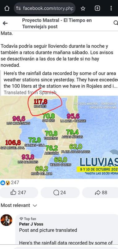 Ondertussen gaan de regens in het oosten en zuidoosten van Spanje, samenhangend met het kleverige hoogtelaag ALICE, nog even door. In de Valenciaanse gemeente Miramar viel op donderdag en vrijdag in totaal 147 mm; vandaag kwam daar nog eens 94 mm bij ofwel deze natte episode staat daar inmiddels op 241 mm. In Barx viel tot vanochtend 186 mm en in het zuiden van de provincie Alicante kreeg Pilar de Horadada 191 mm te verstouwen. In de provincie Murcia registreerde Calblanque 218 mm. De enorme regenval veroorzaakt op veel plaatsen ernstige wateroverlast.