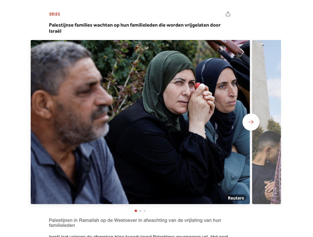 Beetje ongemakkelijk gevoel hoe de NOS de hereniging van Palestijnse criminelen met hun familie in beeld brengt alsof er gijzelaars zijn vrijgelaten. Zie al de hele tijd zo'n foto prominent op de website. Of waren ze allemaal onterecht opgepakt terwijl ze onder de boom domino aan het spelen waren?