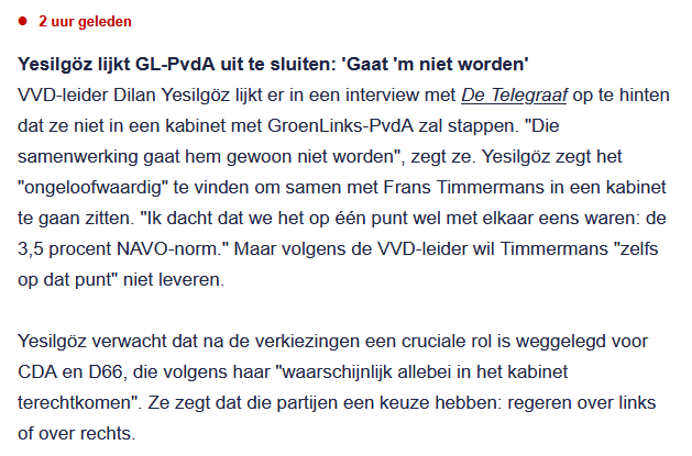 Dat er geen samenwerking met Timmermans gaat komen lijkt me duidelijk. Heel vervelend voor Dilan, maar er gaat geen samenwerking komen tussen haar en wie dan ook, aangezien zij er na de verkiezingen meteen uitgetrapt zal worden.quote: