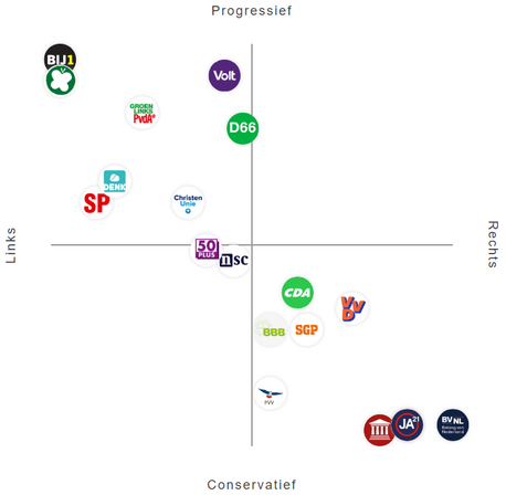 D66 zit ook een fractie links van het midden. Maar de laatste weken is Jetten wat meer aan oud-VVD stemmers aan het trekken met Bontebal, dus het voelt wat aan alsof D66 nu wat meer naar rechts trekt.